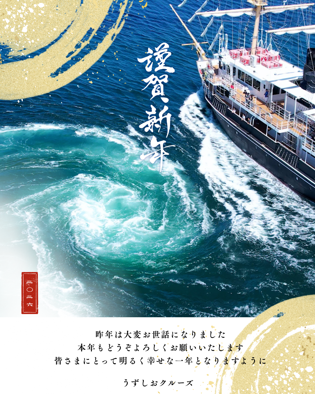2026/01/01 お知らせ 謹賀新年 旧年中は格別のご厚情を賜り、誠にありがとうございました。 2026年も、淡路島福良港より、皆さまに「感動の航海」をお届けできるよう精一杯努めてまいります。 新春の澄んだ空気の中で、力強く巻く「冬の渦潮」とともに、皆さまのご乗船を心よりお待ち申し上げております。 本年も「うずしおクルーズ」をどうぞよろしくお願い申し上げます。 前へ 一覧へ
